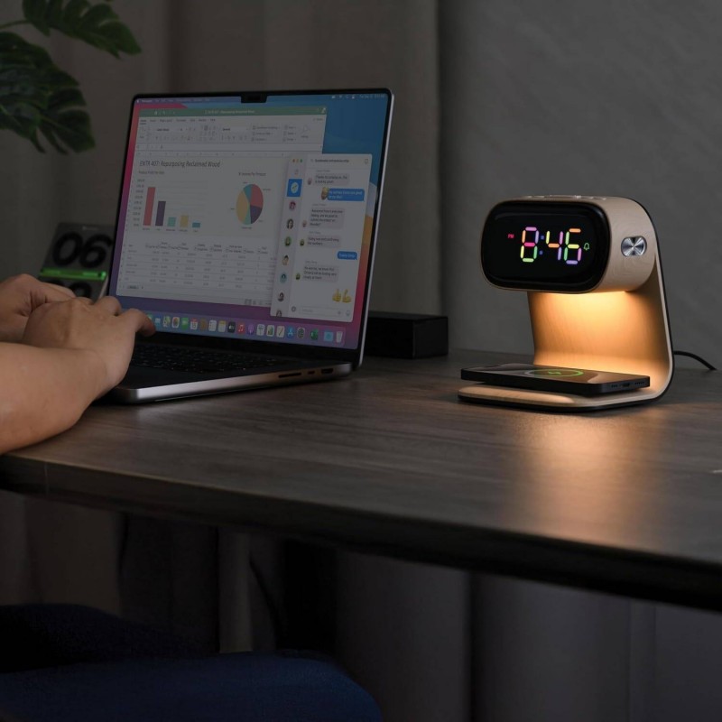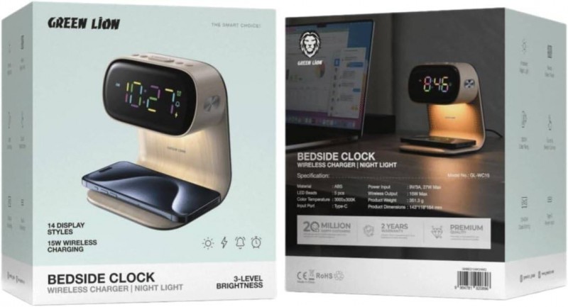 ساعة منبه و شاحن لاسلكي من Green Lion – تشطيب خشبي فاخر