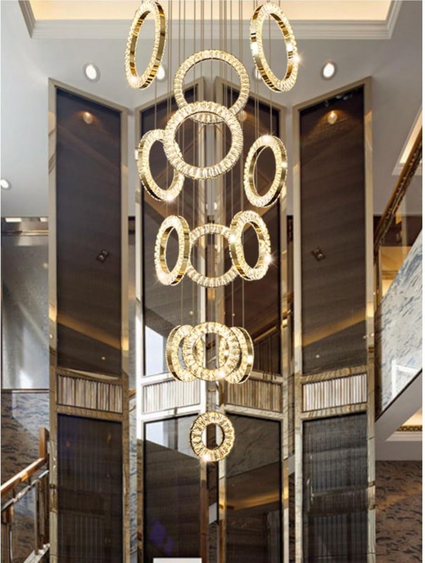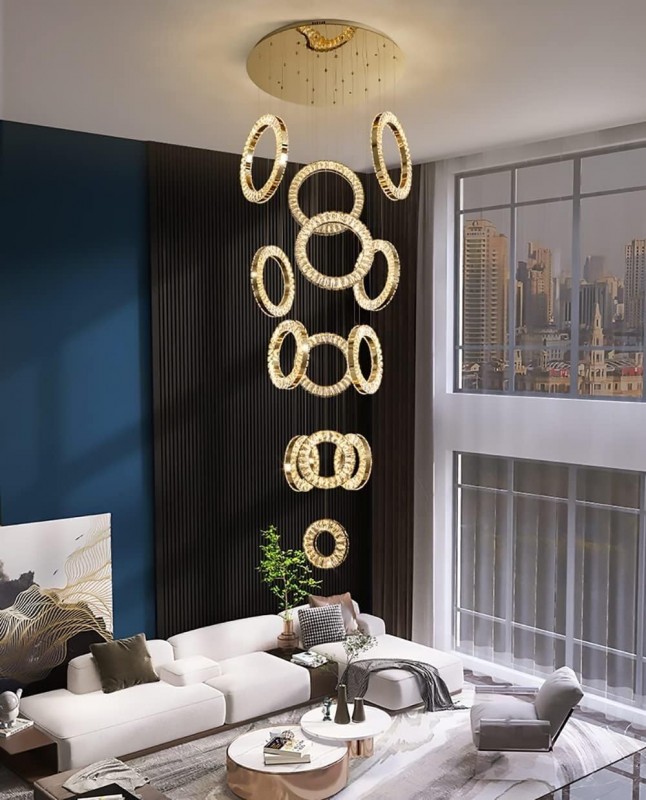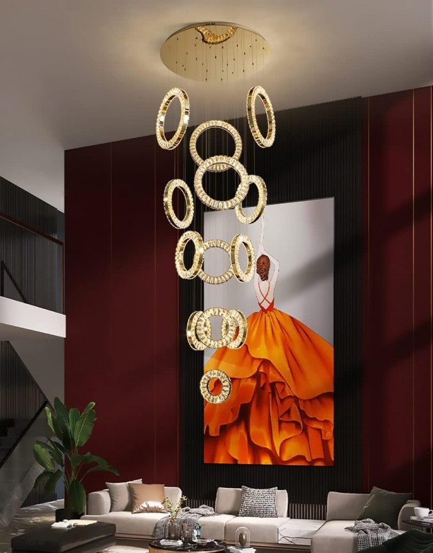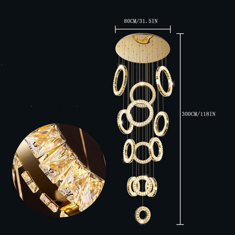 حوّل سقف منزلك إلى تحفة فنية مع هذه الثريا الفاخرة المصنوعة من المعدن المطلي بالذهب والكريستال اللامع. تصميمها المكوّن من 13 حلقة يمنحك إضاءة ساحرة ومظهرًا معماريًا فريدًا يضيف لمسة من الرقي لأي مساحة داخلية.