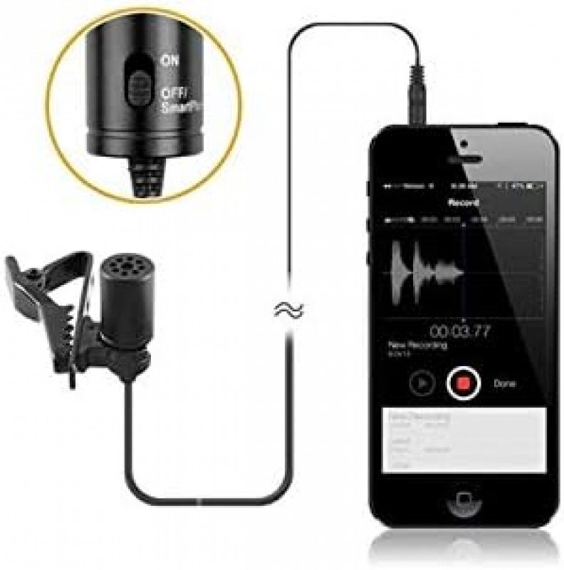 🔹 تصميم عملي وخفيف الوزن: ميكروفون لافاليير صغير الحجم (20غ فقط)، سهل الاستخدام والتنقل، مع كابل بطول 6 أمتار يمنحك حرية الحركة أثناء التسجيل.