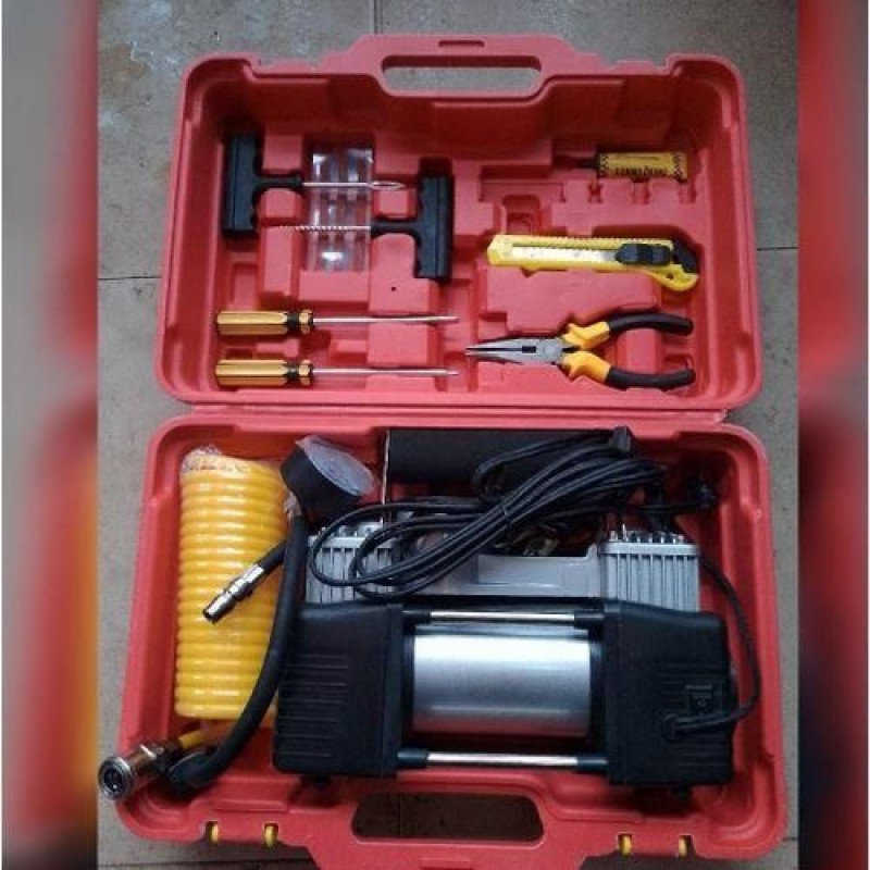 ✨ جاهز لأي طارئ على الطريق! ضاغط الهواء الراسين مع طقم عدة البدي هو الحل العملي والسريع لأي مشكلة في الإطارات، سواء أثناء السفر أو داخل المدينة.